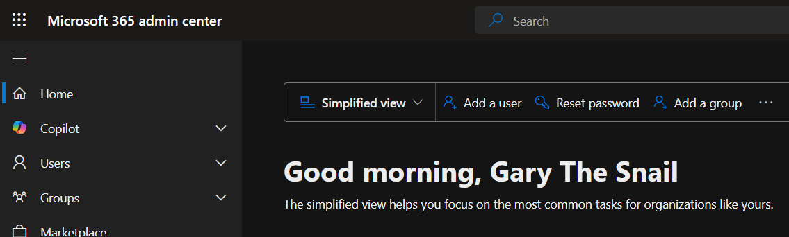 I thought I might not be able to use Planner this morning since my trial subscription ended. I logged into the Microsoft 365 admin center, and this made me smile as I'd forgotten that I changed the admin username.