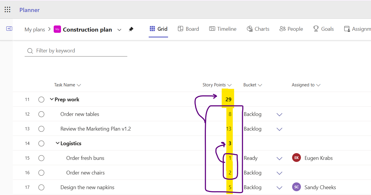 Magically, the values in subtasks are added up and displayed in the top-level task. It even works with subtasks that have subtasks as shown here under "Logistics"