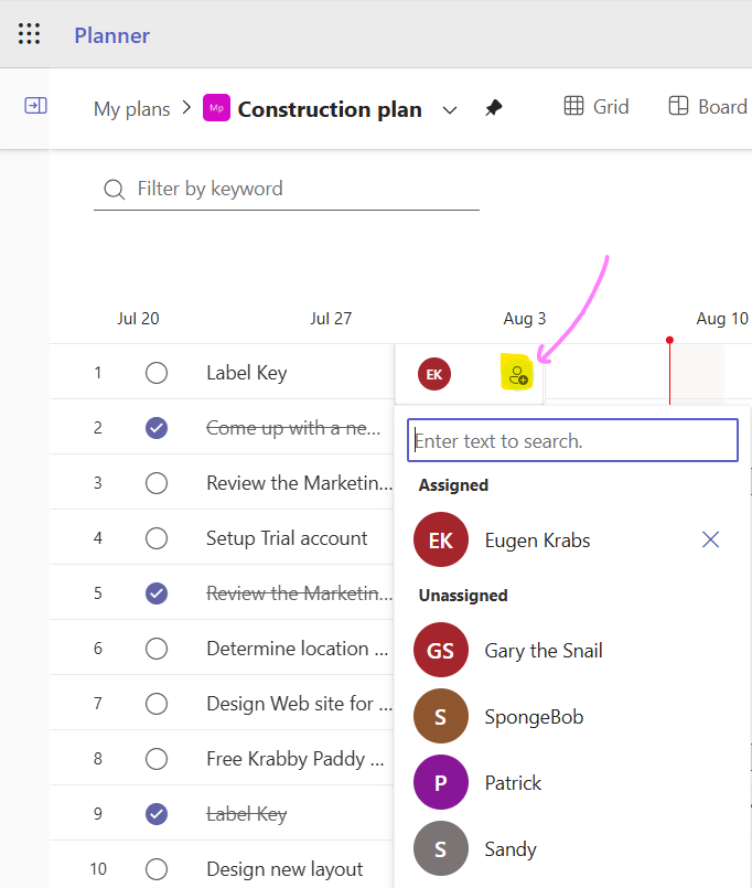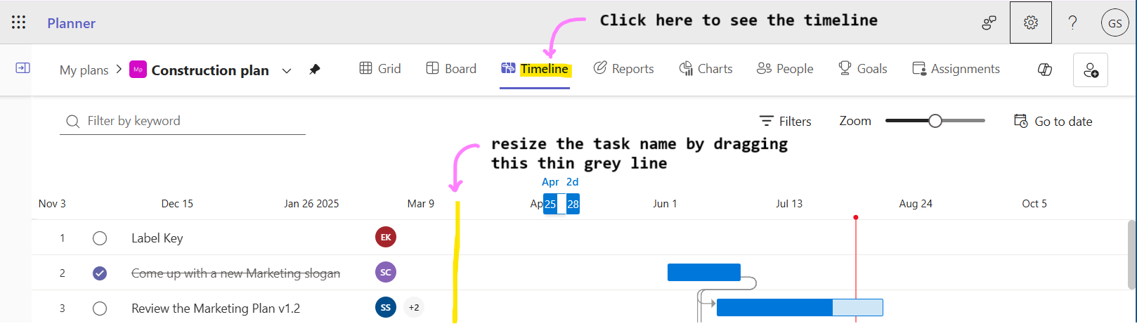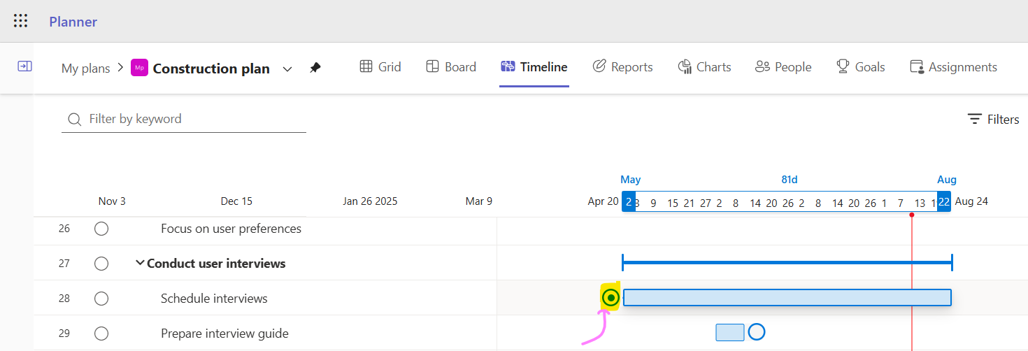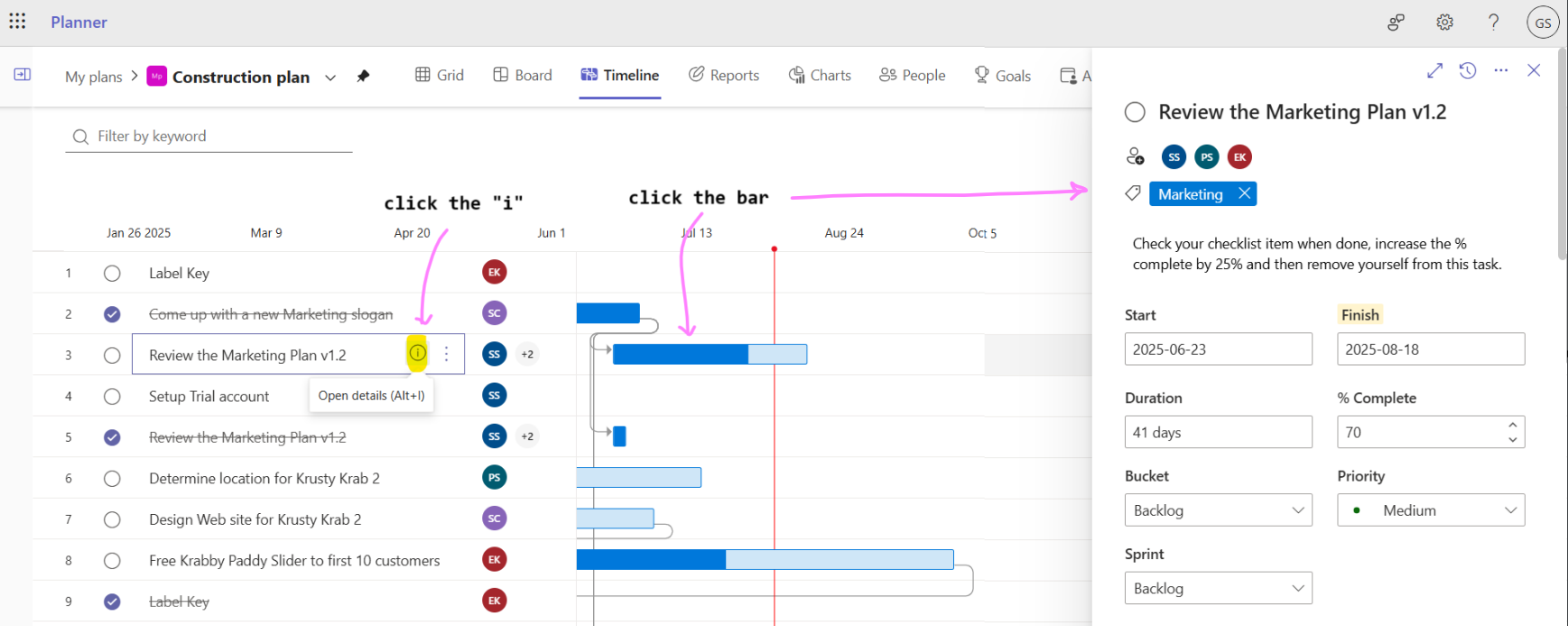 Like in the many of the other Planner views such as Grid or People, you can modify a task from the Timeline view. Here's how: