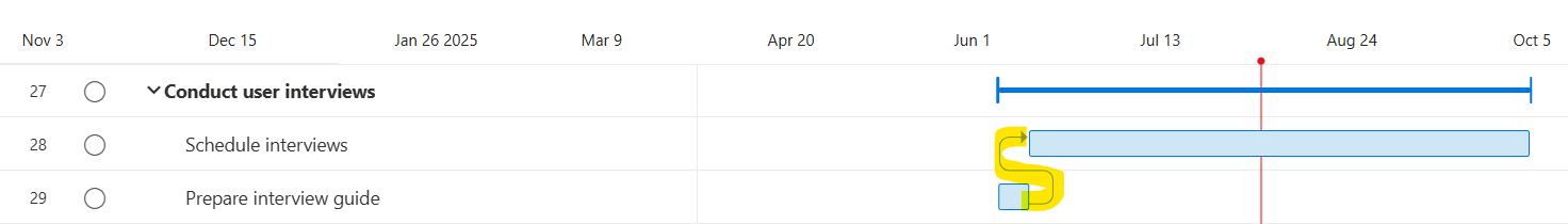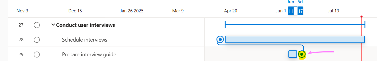 - Click the circle and drag it to the task's bar that you want it to depend on