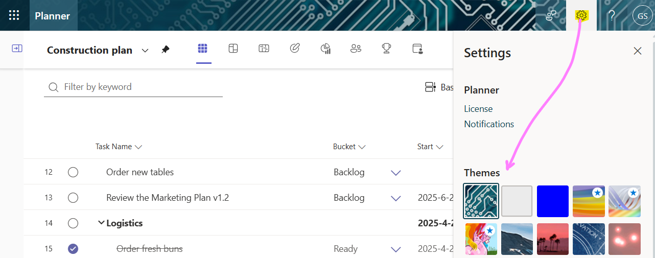 A quick personalization tip in case you hadn't already seen it. If you click the gear icon on the top right of Planner, you can change the theme. In that panel you can also change your notifications.