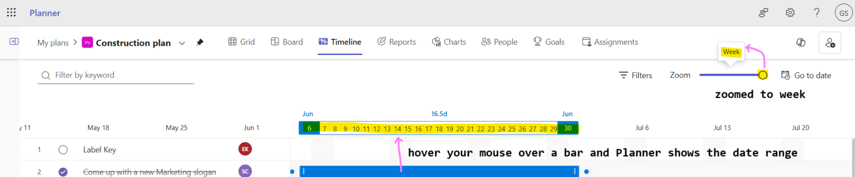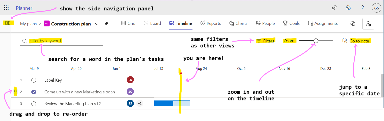 Here's a screenshot of the Timeline view in Planner with callouts for each navigational element.