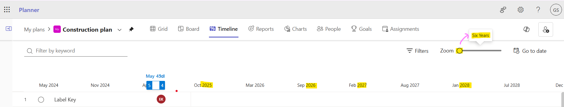 For the zoom control at the top of the page, hover over the circle and Planner will tell you the duration of the view. In this case I've zoomed out to 6 years. I've never run a 6-year project but where I work now the construction projects can go that long for certain.