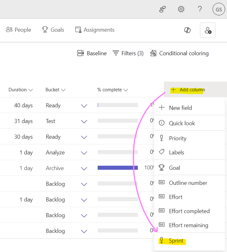 A new column will be added to the table and you can then assign tasks to sprints from within the table.