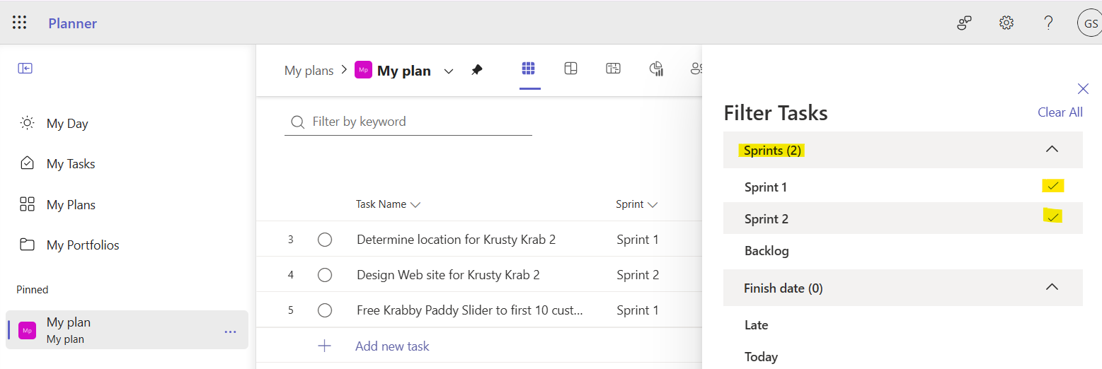 Just like all of the other Planner features, you can filter your project Tasks by sprints in pretty much every view here: