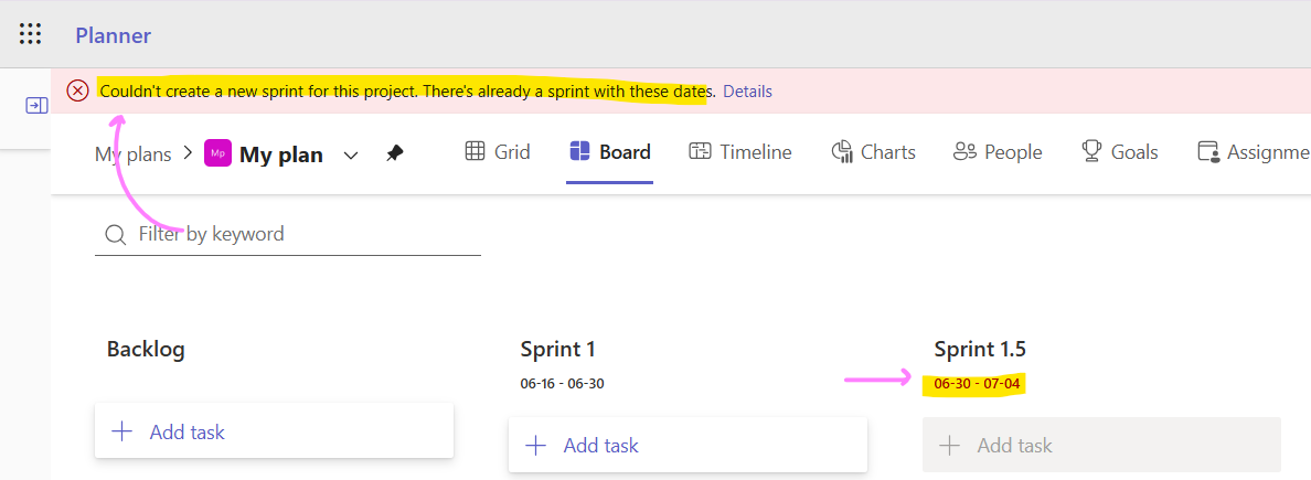 If you create an overlapping sprint, Planner still displays the sprint as well as a thin error message at the top of the page.